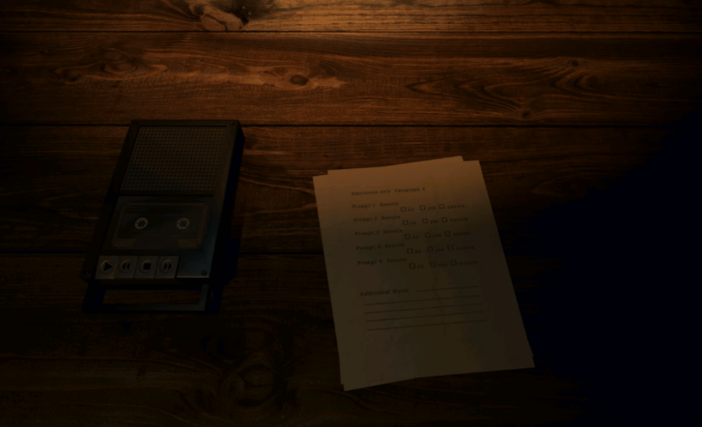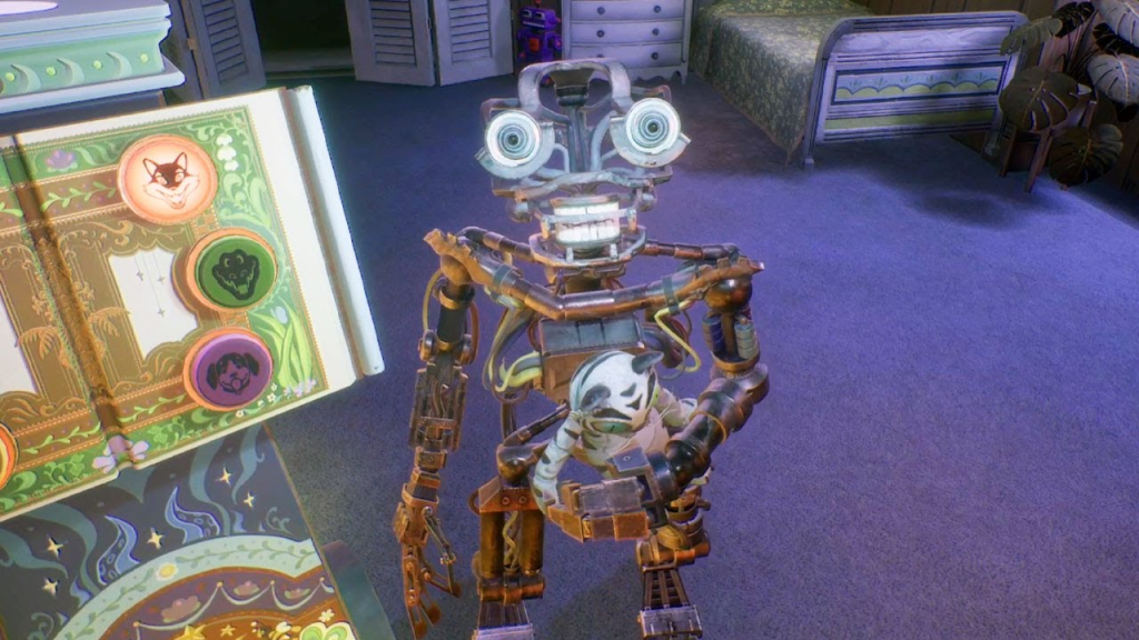 Redeemed Ending: Inside Edwin’s home, Arnold takes the White Tiger Doll out of storage. Navigating through a duct, Arnold appears in a room made for David. Placing the doll on a pedestal, an audio recording of Edwin and Fiona plays, as the Mimic slowly emerges from the closet. Using a quilted display of animals, Arnold pushes the corresponding animal face buttons to play a story, stopping the Mimic’s advances on him. The correct inputs open a port for the Data Diver inside the Mimic, allowing Arnold to upload a program to pacify it, and cause it to take on the stature of a child. Taking the doll, “David” is told by the recording of Fiona to “sleep tight”, as it goes to the bed. “David” says “I love you.”, and falls asleep, with the screen fading to black.