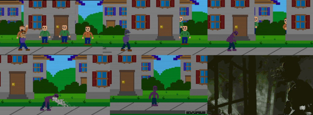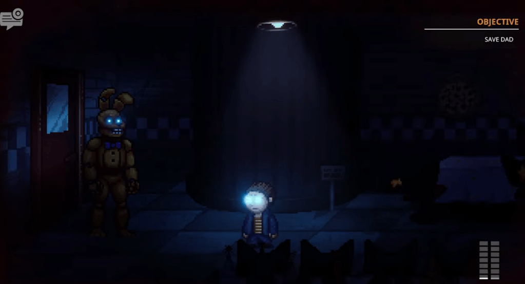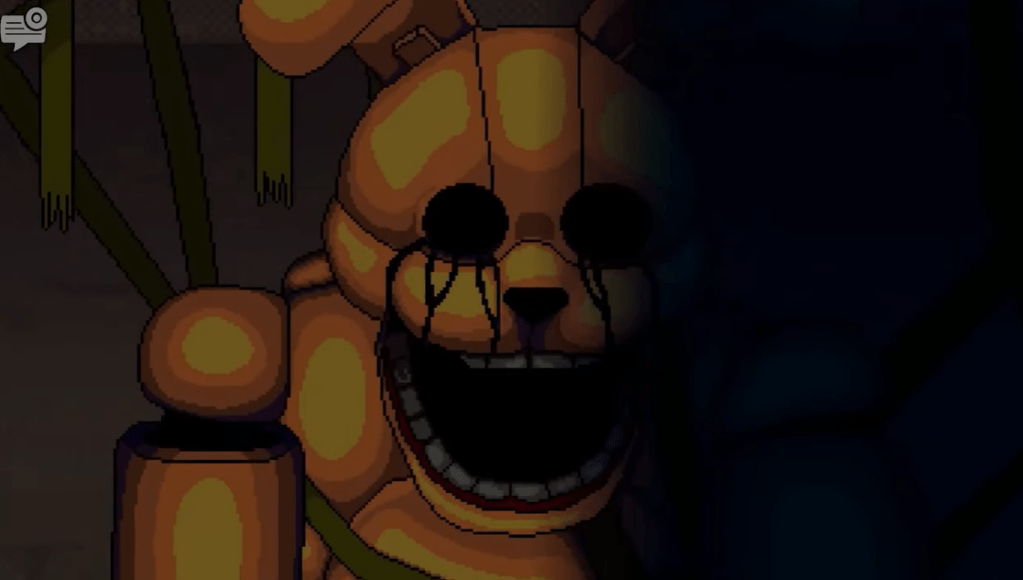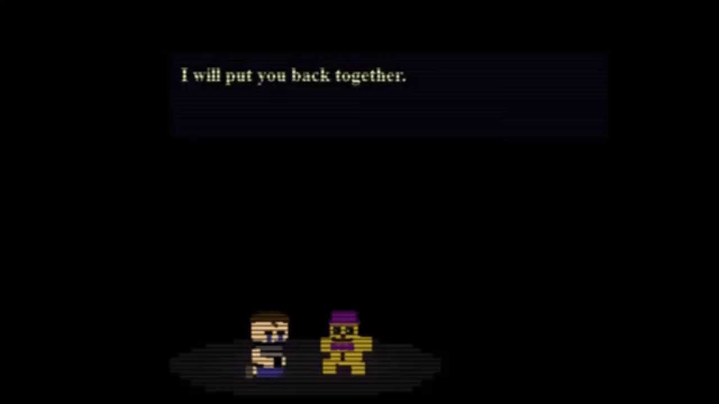 This game seems a bit strange to most of the people playing it, because… it’s not scary. But the back story is actually telling you about the Crying Child. It starts off with the exact same line at the end of Five Nights at Freddy’s 4 (2015), with the golden freddy plushie saying “I will put you back together”, which we theorise is his father William. FNaF World serves as a metafictional, spiritual follow-up to FNaF 4, where the player, guided by a glitchy Fredbear, collects “clocks” in various minigames to “put the crying child back together”. This process mirrors the promise made in FNaF 4, aimed at curing the child’s shattered memories and allowing him to reach his “Happiest Day,” which is connected to the secret ending of Five Nights at Freddy’s 3 (2015).
