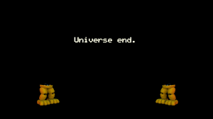 Universe End Ending: To get this ending, the player must meet up with the Fredbear NPC while having Fredbear as their party leader. After the dialogue begins, the background will go black and the two will cock their heads to the side, as if they are short-circuiting, while text explains that the universe cannot have two Fredbears existing in the same place at the same time. Afterwards, their entire upper bodies will explode and the words “Universe end” will appear on the screen, fully implying complete destruction of the Universe with only Fredbear’s legs remaining. This ending can be easily obtained by starting a new game in Fixed Party Mode and setting the blue 1 party marker on Fredbear. Then the ending will occur in the first cutscene of the game. However, Scott Cawthon made it a requirement to obtain every character in the game via Adventure Mode on a separate save file. If this ending is attempted before obtaining every character in a separate Adventure Mode save file, the player will only be able to choose the top 2 rows of characters, making it impossible to obtain this ending, forcing players to do it the hard way or edit their save file. Getting this ending earns the Fredbear Legs trophy on the file select screen.