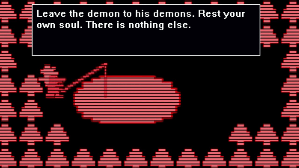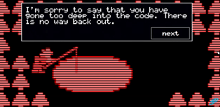 Fourth Glitch Ending: This ending is unlocked upon finding more than three glitches. This is achieved by going to the glitch after the Bubba fight and proceeding as normal until the player reaches the third Sub-Tunnel. The player must then go up, right, up, and right until they reach a corner. Pressing down here will reveal a false wall which leads to another glitch. In the fourth Sub-Tunnel, there is just a man, a lake, and a bunch of trees. Talk to the man, whose name is Old Man Consequences. He tells the player that they have gone too far down into the code and they are stuck here with no way out. He offers to fish with him before a simple “the end” appears in the text box. Upon completion of this ending, it grants a trophy of the Freddy Fazbear sprite that appeared in the ending.