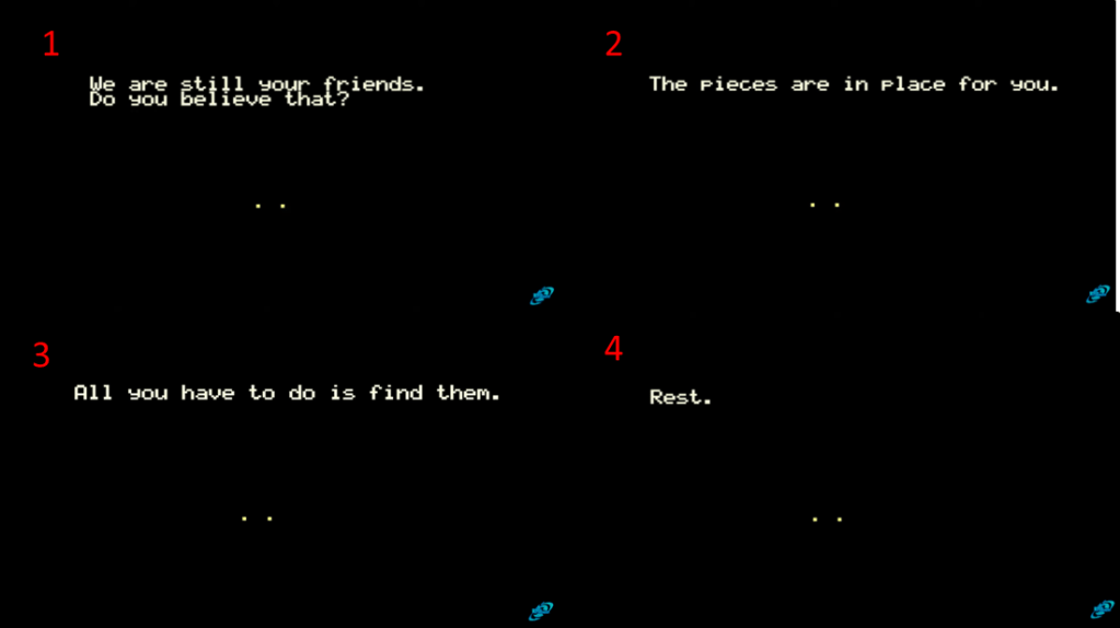 Clock Ending: This ending is unlocked by gathering all the clock pieces and solving their puzzles. To do this, first, any time the player speaks to the storyline Fredbear, they must go through his dialogue until the “DONE” button appears. Do not click it. After staying idle for a few seconds, Fredbear will transform into his 8-bit form and allude to darker things. The figure with only two small yellow eyes that is seen when starting up the game for the first time tells the player “We are still your friends” and “Do you believe that?” similar to the ending cutscene of FNAF 4. It goes on to say that “the pieces are in place for you”, and that all the player has to do is to find them. It then tells the player to rest, before disappearing. A pixelated “the end” appears, and will go away if the player presses the Esc key, or the “F2” key. Upon completing this ending, the Crying Child trophy is earned for the file select screen.