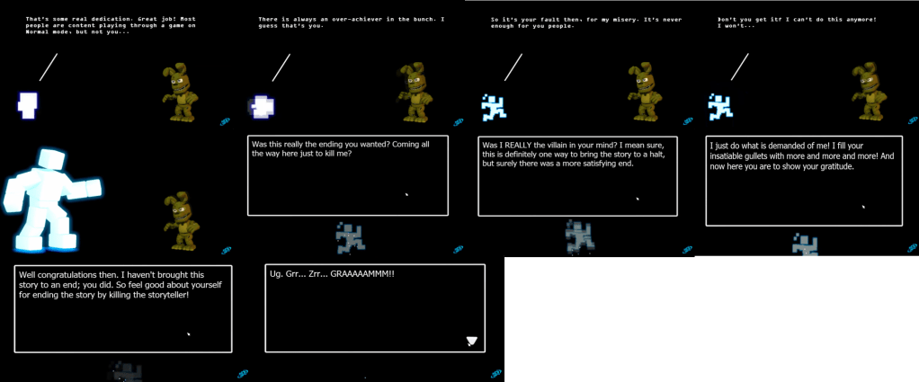 Hard Mode Ending: To reach this ending, the player must play normally through the game, except in Hard Mode. After defeating Security and entering the red tent, the player is transported to a cut-off area of Fazbear Hills. At the end of the path is a portal which leads the player to the true final boss of the game, Animdude, a representation of Scott Cawthon who has the form of his now synonymous avatar. Upon defeat, Animdude chastises the player for their actions, saying he did nothing but give more and more games to the player to appease their insatiable appetite for more games and his repayment was for them to kill him, the storyteller. He then explodes into a cloud of pixels and the words “THE END” appear on the screen, hinting that this is the true or final ending by putting it in uppercase, unlike other “the end” endings which are in lowercase. Upon completion of this ending, the Animdude trophy is added to the file select screen.
