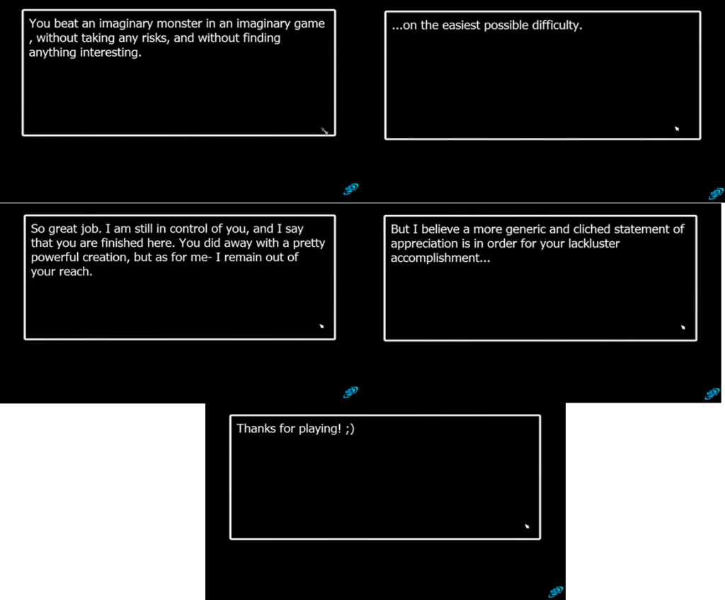 Normal Mode Ending: This ending is unlocked through normal Gameplay in Normal Mode. After getting the Key and unlocking all the security gates, the boss Security stands in the way. Upon defeat, the player can finally enter the tent behind it. However, upon entering, the player is then mocked by a voice for beating an imaginary enemy in an imaginary game on the easiest difficulty. The one behind the voice manipulates the plot to not allow the player to proceed any further, implying something lies beyond the tent on a harder difficulty. This ending grants the Security trophy on the file select screen.