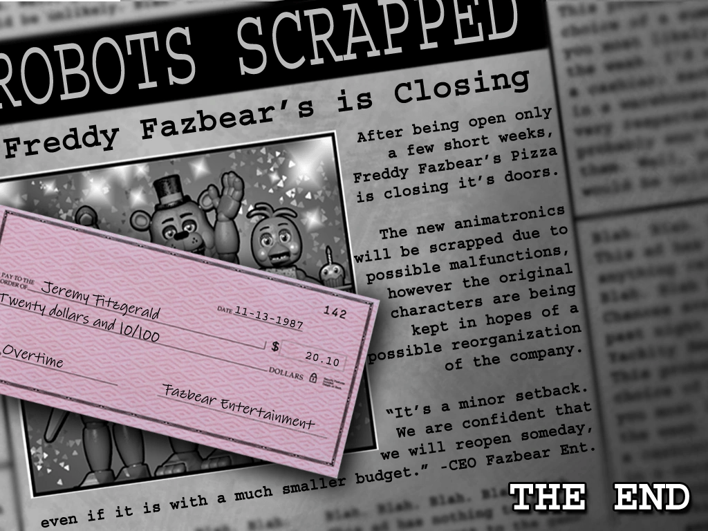 Night 6 Ending: Upon completing Night 6, Jeremy Fitzgerald receives an additional $20.10 as an overtime bonus, attached to a newspaper article saying that Freddy Fazbear’s Pizza is closing down.