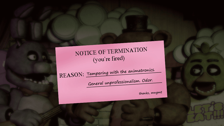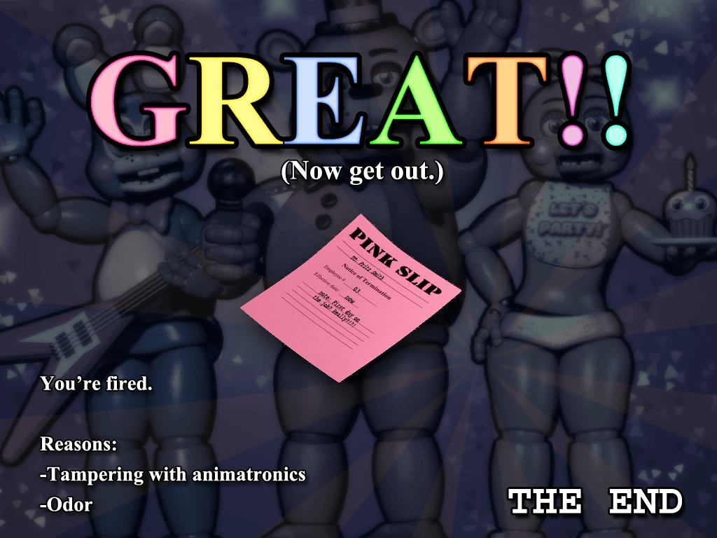 Custom Night Ending: Upon completing Custom Night, Fritz Smith receives a pink slip of termination stating that he’s fired for tampering with the animatronics and having an odor. The pink slip also has a comment berating Fritz for getting fired on his first night on the job.