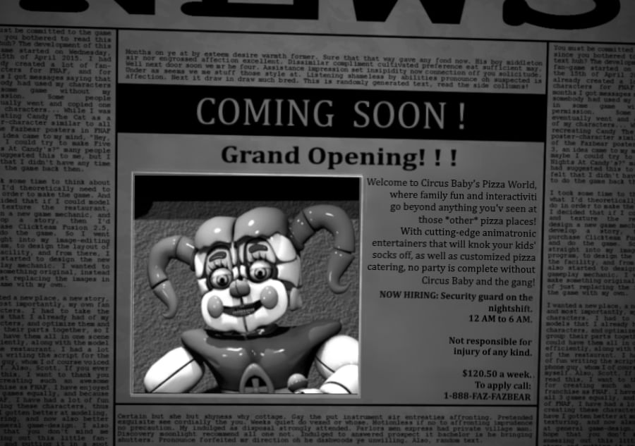 His daughter Elizabeth Afton was facinated by Circus Baby and would want to play with it. Her father told her not to and gave strict instructions, but Elizabeth finally met Circus Baby at her debue and was killed instantly. William Afton immediatly realised that the eyes from Circus Baby changed from blue to green. Which further facinated him at the spirits possessing animatronics. The ai system and Elizabeth become as one and Circus Baby has an interesting mention about a springlock failure which happened there and it is also mentioned in FNAF 3 by the phone guy. This hasn’t been explained, but we’ll see, as it would be the first in many more to come. Circus Baby’s Pizzeria quickly closed with a public statemnt saying that it was closed due to gas leaks… But it wasn’t a loss for William as he learnt that his experiments were a success as a child dying near metal while experiencing strong emotions could possess it and essentially become immortal.
