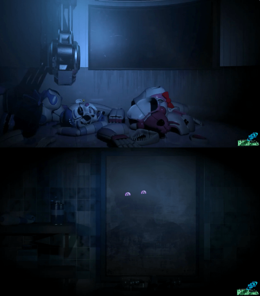 Real Ending: After following Circus Baby’s instructions, Michael Afton will be taken to the Scooping Room, where after some dialogue from Circus Baby, the Scooper turns on, killing Michael. Then, the player will be taken to a cutscene where Michael’s silhouette appears in front of a mirror, with purple glowing eyes, while it’s actually Ennard using Michael’s skin.