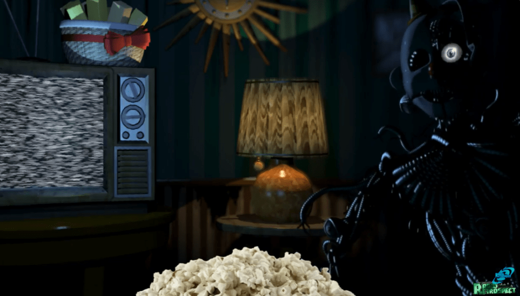 Fake Ending: If the player has gotten the secret ending to the death minigame, then they will be granted access to the Private Room, where they must survive against Ennard, classic FNaF style – Surviving until 6AM while sitting in the Private Room office. Upon reaching 6AM, Michael returns home to watch the season finale of The Immortal and the Restless. After the episode ends, Ennard appears, dragging himself near the right side of the room, indicating that even if the ending described here were canon, Ennard would have found a way to kill Michael anyway. During this sequence, the basket of Exotic Butters can be seen on top of the TV.