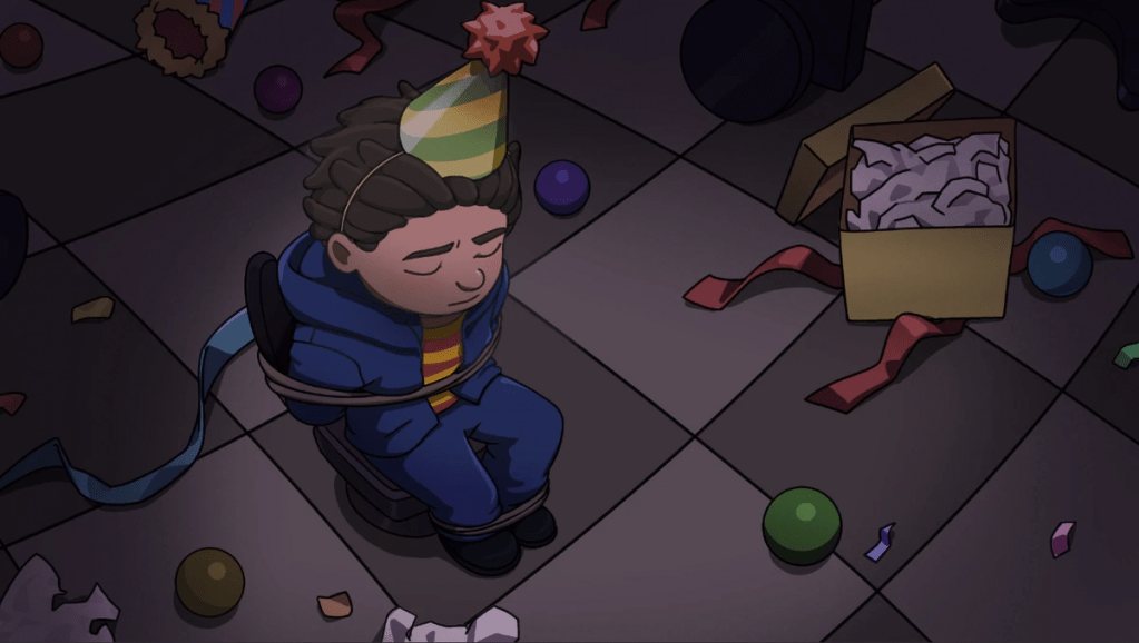 1 Star Ending: Survive all five nights. This earns the “Pit-y Party” achievement. After Oswald saves his dad, he tries to explain but the yellow thing emerges from the pit, grabbing Oswald and violently dragging him in. A cutscene plays showing Oswald knocked out and tied down to a chair in what’s presumed to be the party room. A party hat on his head. It then shows Oswald waking up terrified as a door opens and a shadow looms over him. the screen goes black and the yellow rabbit’s laugh plays. Oswald presumably dies.