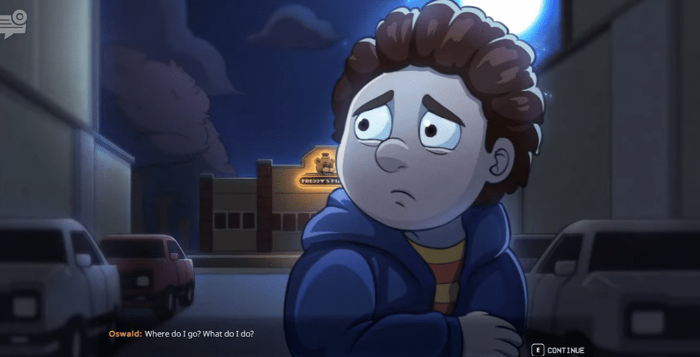 Hobo Ending: After meeting the Yellow Rabbit, walk outside the front door of Freddy Fazbear’s Pizza. This earns the “See Ya Dad!” achievement. After attaining the Hobo Ending, the player will not be able to leave from the entrance anymore. If the player continues to interact with the door, Oswald comments, “Nope. You’ve seen what happened last time.” and “… Seriously?”