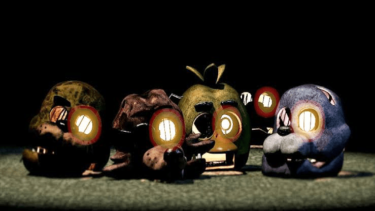 Good Ending: To achieve the Good Ending, the player must get the cake ending for the minigames. If the player has gotten the Cake Endings of the secret minigames, then after the Night 5 minigame ends, the player will be taken to a screen featuring the illuminated heads of Freddy Fazbear, Foxy, Chica, and Bonnie, but the animatronic heads are empty, symbolizing that the souls of William Afton’s victims have been freed. The fifth head from the Bad Ending is nowhere to be seen, even if the player brightens the image. It should be noted that the positions of the animatronics heads match the gravestones in the lorekeeper ending in Freddy Fazbear’s Pizzeria Simulator, heavily implying that those are the names of the souls that had inhabited the animatronics.